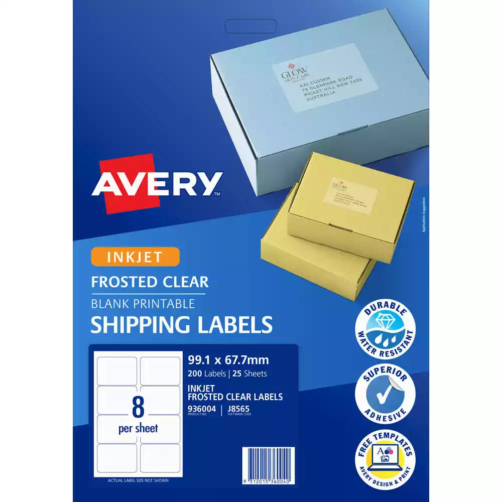 Add a clean and professional finish to your gifts, parcels and boxes with Avery Clear with Matt Finish Labels | The matt finish is ideal for elegant application on black and dark surfaces | You can create custom labels using free Avery software and templates | The Quick Peel Pop-up Edge feature allows you quickly and easily detach the label from the backing sheet for more efficient labelling | Labels provide a contemporary matt frosted finish | Ideal for elegant parcels, boxes and gifts with black or dark surfaces | Features Quick Peel Pop-up Edge technology: bend back the sheet and the label edge pops-up | Compatible with inkjet printers and Smudge Free guaranteed | Supported by free Avery software and templates available at averyproducts.com.au/print