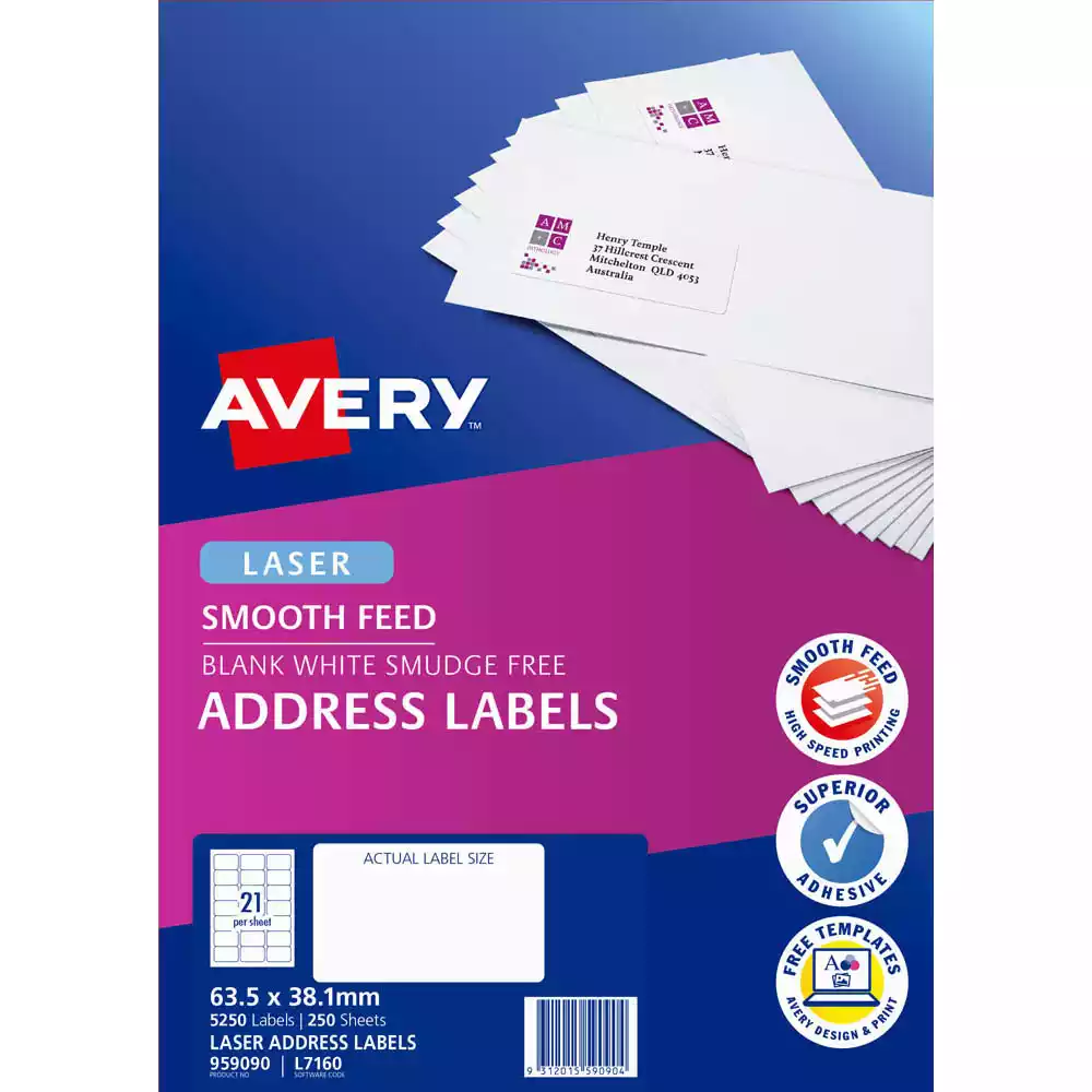 Picture of AVERY 959090 L7160 ADDRESS LABEL SMOOTH FEED LASER 21UP WHITE PACK 250 Picture of AVERY 959090 L7160 ADDRESS LABEL SMOOTH FEED LASER 21UP WHITE PACK 250