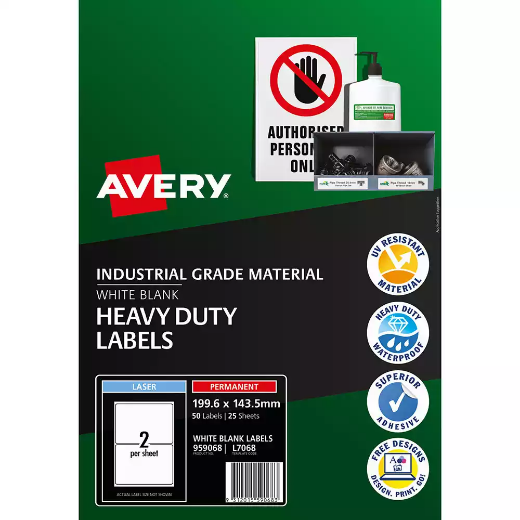 Got a pallet of products to deliver? Will your pallet encounter extreme conditions? To make sure the right products end up at the right destination pallet labels can be placed on the pallet with all the information you need | Pallet labelling doesn't need to be expensive and you don't need external suppliers | You can design your own labels for packaging in your office as and when you need them | Using the free downloadable software and templates from Avery you can print A5 labels with everything from your recipients address to order codes, so nothing goes astray | For more durability than a normal paper label | Ideal to mark your property with your contact details, to label products or brochures for sale or display and to create warning signs or instructions | Oil and dirt resistant, splash proof, tear proof and unaffected by temperature changes between -20 to + 80 Deg C | UV-resistant, water-resistant and weatherproof | Suitable for B/W and colour laser printers