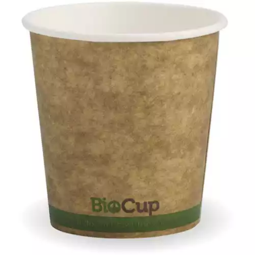 Paper BioCups are producing from sustainably sourced paper from managed plantations with a bioplastic lining made from plants not oil | Suitable lids include BCL-4, BCL-4W and BCL-4B | This cup is printed kraft-look | Single Wall