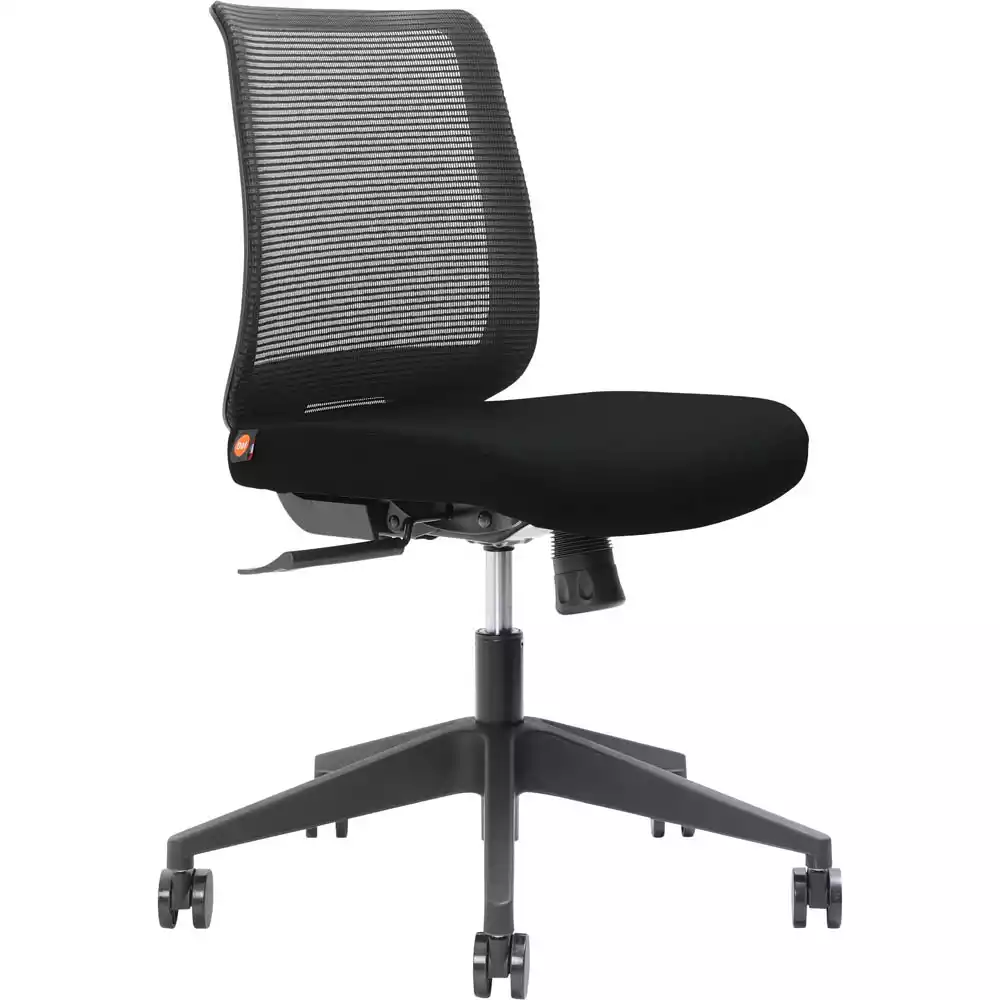Brindis low back task chair with tension adjustable synchro mech | Back and seat move to support your body as you move | Permanent contact with seat and back with a tilt lock included | Upholstered with black mesh back and B-20 black fabric seat and a 5-start nylon base | Mesh back | Adjustable lumbar support | Synchro mechanism | 3 position lock | Synchro tension adjustment | Gas lift hight adjustment