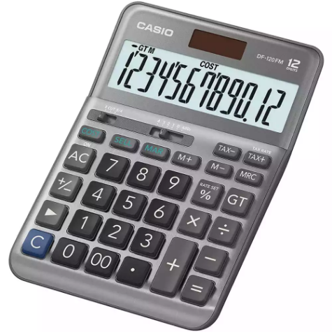 Automatic calculation of price plus tax, price less tax, discount, selling price, tax amount, discount amount, and margin amount | Calculate the cost, selling price, or margin of profit on an item, given the other two values | Solar powered when light is sufficient, battery powered when light is insufficient | A symbol (+, -, x, /) on the display indicates the status of operation you are currently performing | Rounding selector - F: Floating decimals. CUT: Values are cut off. UP: Values are rounded up. 5/4: Values are rounded off | Decimal selector - 4,3,2,1,0 : Specifies the number of decimal places as 4,3,2,1,0. ADD2: 2 decimal places are assumed for entries and results of all addition and subtraction operations | Key operations are stored in a buffer, so nothing is lost even during high-speed input | Larger display makes more data easier to read | Plastic keys - Designed and engineered for easy operation | Profit margin percent key gives quick access to prices and profits, and also delivers add-ons, discounts, ratios and increase/decrease values | Tough cover stands up to rough treatment