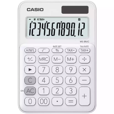 Automatic calculation of price plus tax, price less tax, discount, selling price, tax amount, discount amount, and margin amount | Time calculation allows easy input and calculation of hour, minute, and second values | Solar powered when light is sufficient, battery powered when light is insufficient | A symbol (+, -, x, /) on the display indicates the status of operation you are currently performing | Key operations are stored in a buffer, so nothing is lost even during high-speed input | Larger display makes more data easier to read | Designed and engineered for easy operation | Profit margin percent '%' key gives quick access to prices and profits, and also delivers add-ons, discounts, ratios and increase/decrease values | Mini Desk Type | 12 digits display