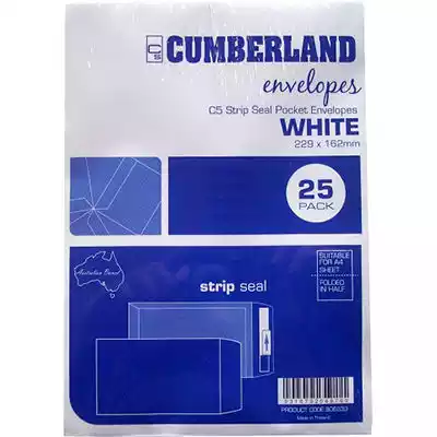 CUMBERLAND C5 ENVELOPES POCKET PLAINFACE STRIP SEAL 85GSM 162 X 229MM WHITE PACK 25