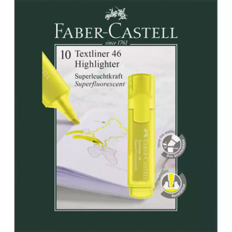 Faber-Castell Textliners contain a versatile tip allowing you to mark in 3 line widths, depending on the angle you hold the pen | Textliners contain a water-based, super fluorescent ink making them perfect for use on most papers | 1mm, 2mm or 5mm lines depending on the angle you hold the chisel nib | Perfect for marking and emphasising text, diagrams and other important work | Water-based ink which ensures super fluorescent marking | Pen colour matches the ink colour to help you find the right highlighter