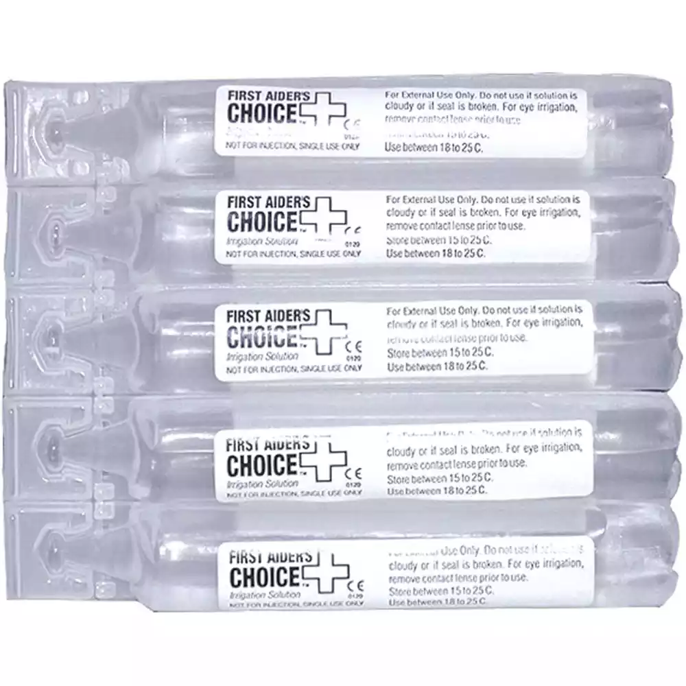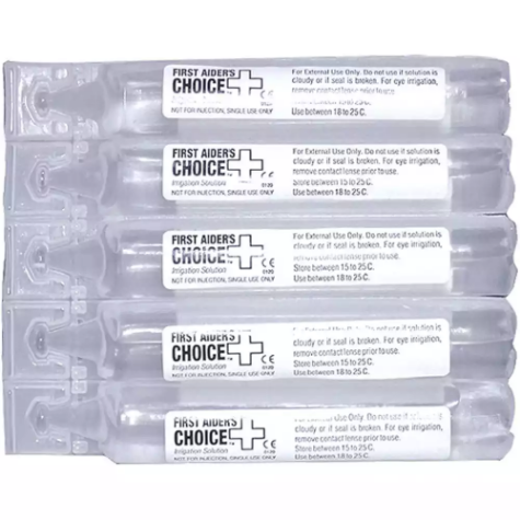 The First aiders choice saline solution is handy to have around the home or the workplace, they can be used in case of an accident or emergency to clean the eyeball and prevent further damage or infection | Ideal for locations where mains tap water is not readily available for eye irrigation | Ideal for eye wash and wound irrigation | Single use | 0.9% sodium chloride solution | Contains a Sterile Sodium Chloride (Saline) solution | Sterile When Container Intact | Also useful with hard and soft contact lenses | | GENERAL INFORMATION INTENDED PURPOSE | For irrigating the eyes to relieve irritation and to assist in removing loose foreign bodies and for superficial wound irrigation.