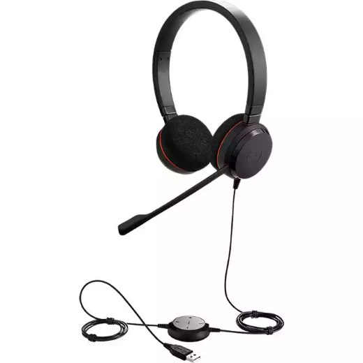 The Jabra Evolve 20 Stereo is a professional headset with easy call management and great sound for calls and music, Great sound for calls and music, Call control unit for managing calls, Plug-and-play connectivity | Easy call management - Get easy access to the most used functions, such as volume and mute. You can also answer and end calls directly from the control unit | Passive Noise Cancellation - Simply wear the headset to eliminate high-frequency noise, such as human voices - all thanks to the specially designed ear cushions. Jabra calls this 'passive noise cancellation' | Ultimate noise cancellation microphone - State-of-the-art, noise-cancelling microphone eliminates background noise. The ear cushions are designed to reduce high-frequency sounds. You and your conversation partner won't struggle to hear each other | Plug-and-play setup - The headset works out of the box with all leading systems. Installation is as easy as simply plugging it in | The Jabra Evolve 20 has Passive Noise Cancellation. Simply wear the headset to eliminate high-frequency noise, such as human voices - all thanks to the specially designed ear cushions | Compatible with your platform, All Jabra USB headsets and speakerphones work with all the most popular online voice call services | Jabra products work out of the box and allow you to combine perfect sound quality with great comfort