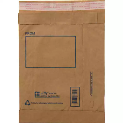 Jiffy padded mailbag provides cushioning protection with 100% recycled paper fibre interior | Double fold corners and glued bottom flap provides: excellent edge and corner protection | Rugged, all purpose paper fibre mailers that provide outstanding cushioning and rigidity | Smooth inner liner allows for easy product insertion | Convenient self-Seal closure together with tear-Tape for easy opening | Strong, heavy-duty Kraft exterior