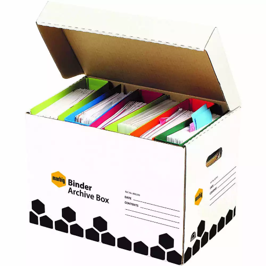 The Marbig archive box range is perfect for all your archiving needs | The only archive box designed to hold 6 lever arch files | 50% larger for archiving ring binders and lever arch files | Triple end walls and double layer base provide superior stacking strength - up to 10 high | 'Burst Safe' double layer base ensures contents will not burst through when carried, even with a heavy 20kg load | Holds manilla folders, or up to 6 A4 lever arch files, or 12 ring binders | The added convenience of a hinged, attached lid | Australian made from 100% recycled board and is 100% recyclable | Label, track and find all your archived documents using the FREE online Marbig Archive Box Management System www.marbig.com.au/archivesystem