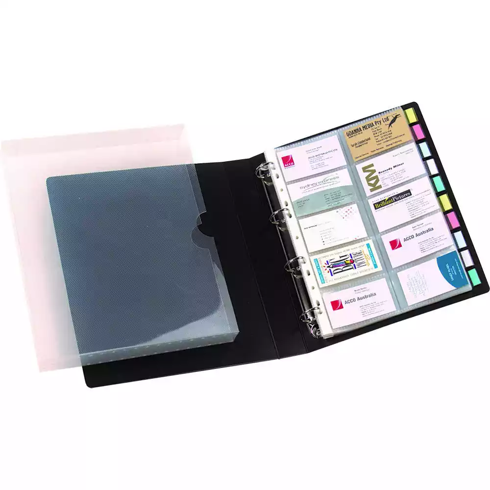 Marbig business card book case is made from polypropylene with a ribbed finish for a professional appearance | Includes case for storing on desks or shelves to enable file to stand upright and allows for easy transportation | Includes pockets, tabs and inserts for personalised indexing of business cards | 4D ring binder with capacity for 500 business cards | Pockets are reinforced for durability and long life