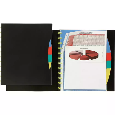 The Marbig refillable display book with unique kwik zip action allows you to easily add, remove and interchange pages as required | Includes 5-Tab pocket dividers with insert tabs | Unique front cover design allows for viewing of dividers when book is closed | Extra wide display book to house dividers and bulky papers | Folds open 180 degrees, making it ideal for photocopying | Acid Free | Copysafe | Refills available