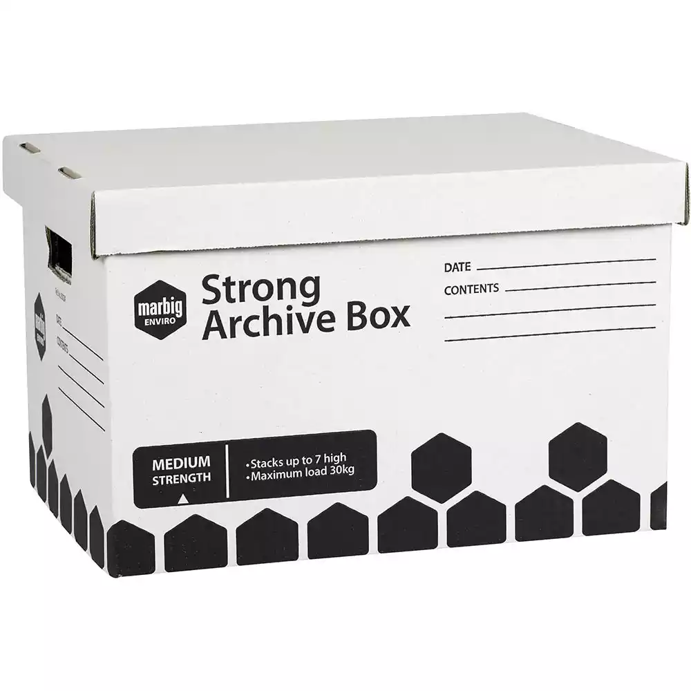The Marbig archive box range is perfect for all your archiving needs | Double end walls and double layer base provides superior stacking strength - up to 7 high | Max load 30kg | Strong burst resistant base for regular access and transportation of a mid-weight load | Holds foolscap suspension files/manilla folders, or up to 3 lever arch files, or 6 ring binders | Label, track and find all your archived documents using the FREE online Marbig Archive Box | Management System www.marbig.com.au/archivesystem | Outside dimensions are 420(l) x 320(w) x 260(h)mm | Australian made from 100% recycled board and is 100% recyclable | Buy 20 to receive one bundle
