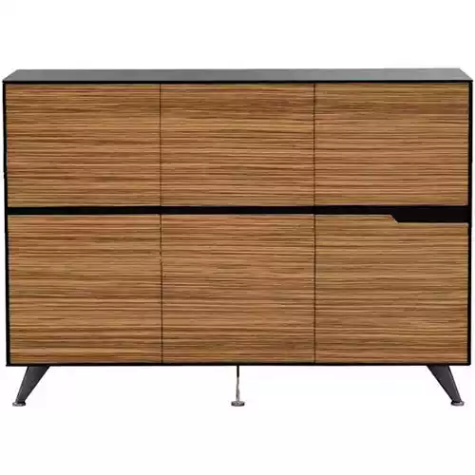 Lux Novara Zebrano real wood veneer credenzas and cabinets in 6 door and 4 door combinations | European one -touch soft close and open mechanisms | Recessed cummerbund handles provide clean lines and profiles | Matching alloy legs and black accents compliment the executive desk for superior European styling