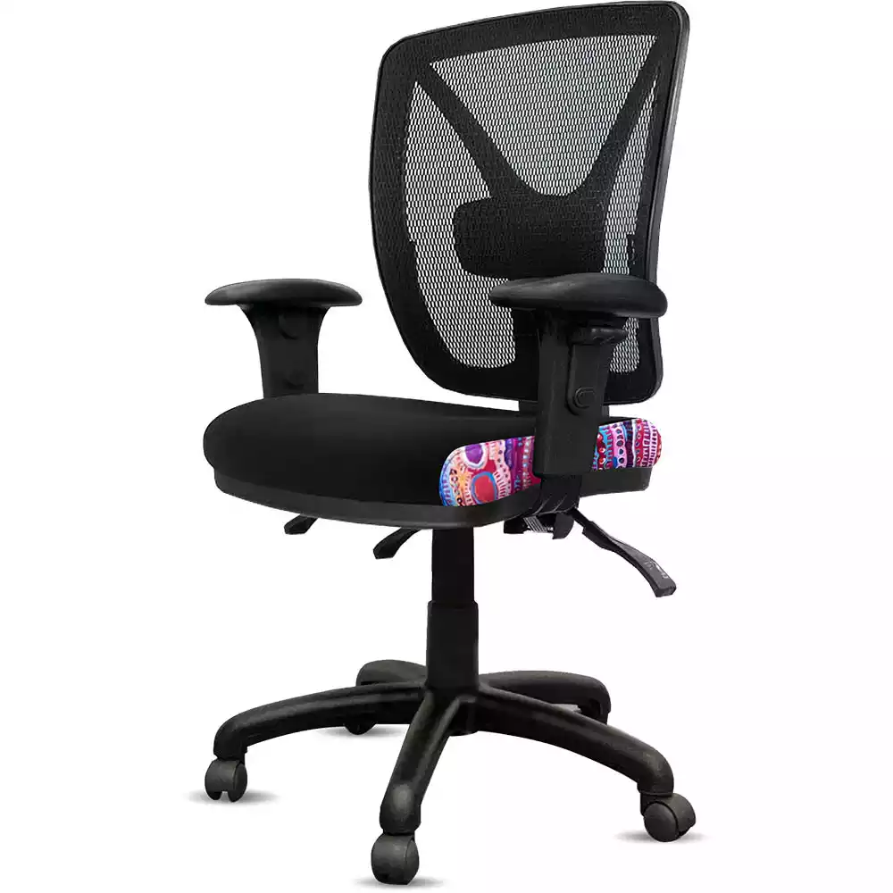 This chair with arms is ergonomically designed to correct and improve users posture, which may otherwise be affected by prolonged hours at work | It features high-quality korean-grade no sweat and breathable mesh back, which creates a super comfy stylish working environment | These AFRDI rated load chairs are perfect for education spaces, universities, or any of?ce areas with indigenous fabric and black commerical fabric upholstered for the seat | Heavy duty commercial chair with 3 lever mechanism and ratchet back height adjustment | AFRDI rated load 160kg approved(excluding arms) | Scallop arm pad on top for height adjustable arms to rest with very strong and durable button locking system | Korean mesh back | Therapeutic postura correct lumbar support | 5 way 700mm commercial grade nylon base | Heavy duty gas lift cylinder | Moulded seat foam for supreme comfort | Fire retardant contoured moulded foam | A unique commercial fabrics designed by Nelly Patterson (Indigenous Artist) combined with K2 black fabric to upholster the chair