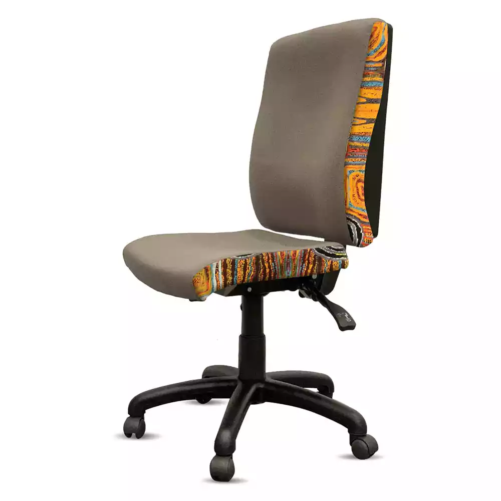 The Chair features a high-quality and soft-to-the touch padded back and seat, which makes working at the office or home a pleasure | This solid and wide heavy-duty chair is ideal for education spaces, universities, or any office areas with indigenous fabric and black commerical fabric upholstered | Heavy commercial chair with fully fabric 3 lever ratchet adjustability | Heavy duty gas lift cylinder | Moulded seat foam for supreme comfort | Fire retardant contoured moulded foam | A unique commercial fabrics designed by STEPHEN JUPURRURLA NELSON (Indigenous Artist) combined with K2 black fabric to upholster the chair