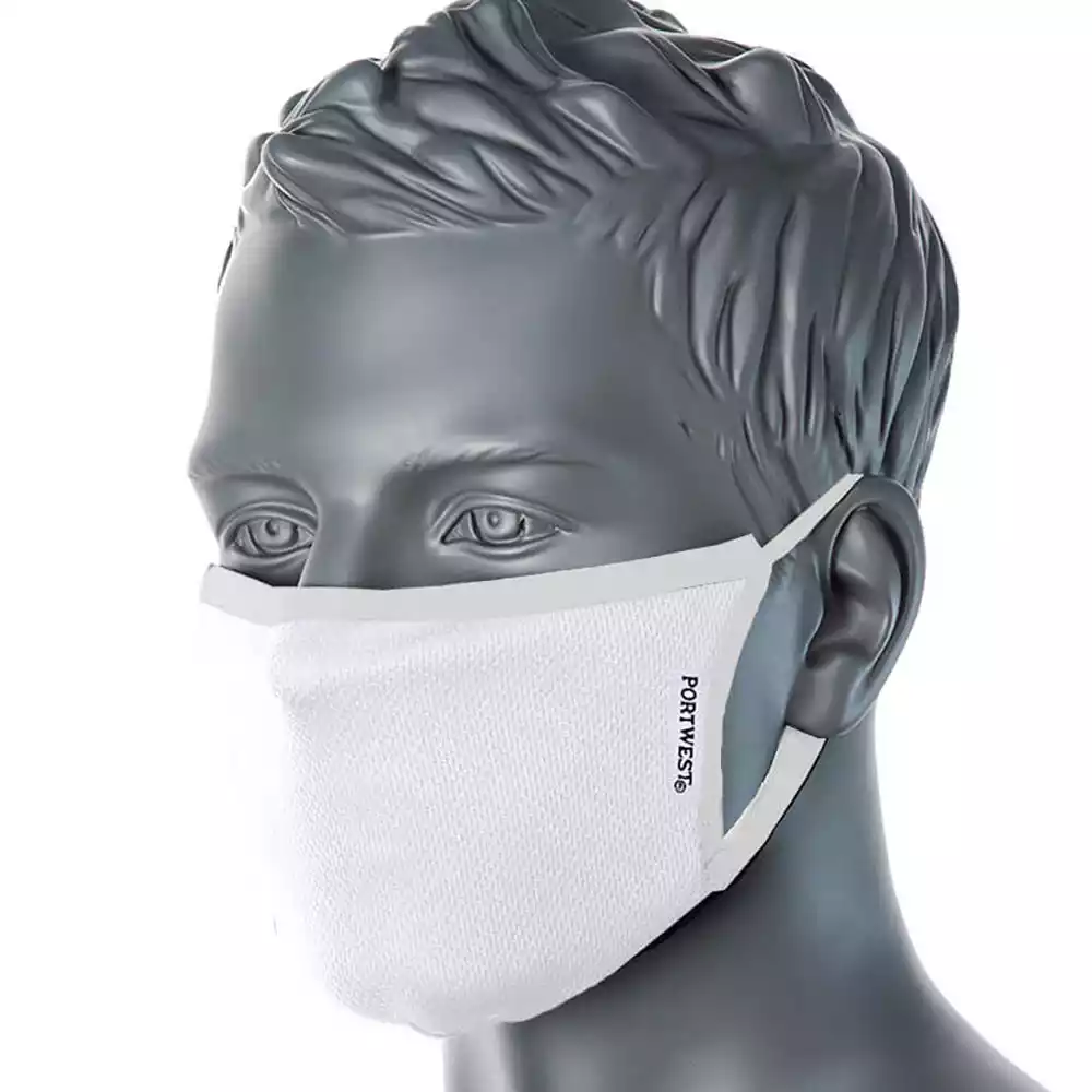 Portwest fabric face mask | 3-ply reusable fabric mask with anti-microbial finish | Kills 99.9% of bacteria and controls numerous odour-causing microorganisms that can accumulate in the fibres from skin contact and laundering | Inner cotton fabric for all day comfort | Elasticated ear loops with adjuster for the perfect fit | Machine washable at 60 degrees | Up to 50 washes | Folded flat each mask is packed inside an individual hygienic poly bag | Individually wrapped inside hygienic polybag | Reusable and machine washable at 60 degrees | Made in Bangladesh | 100% Cotton breathable inner fabric | Anti-microbial finish | Kills 99.9% of bacteria | Odour control | Odour free | Soft-to-touch cotton