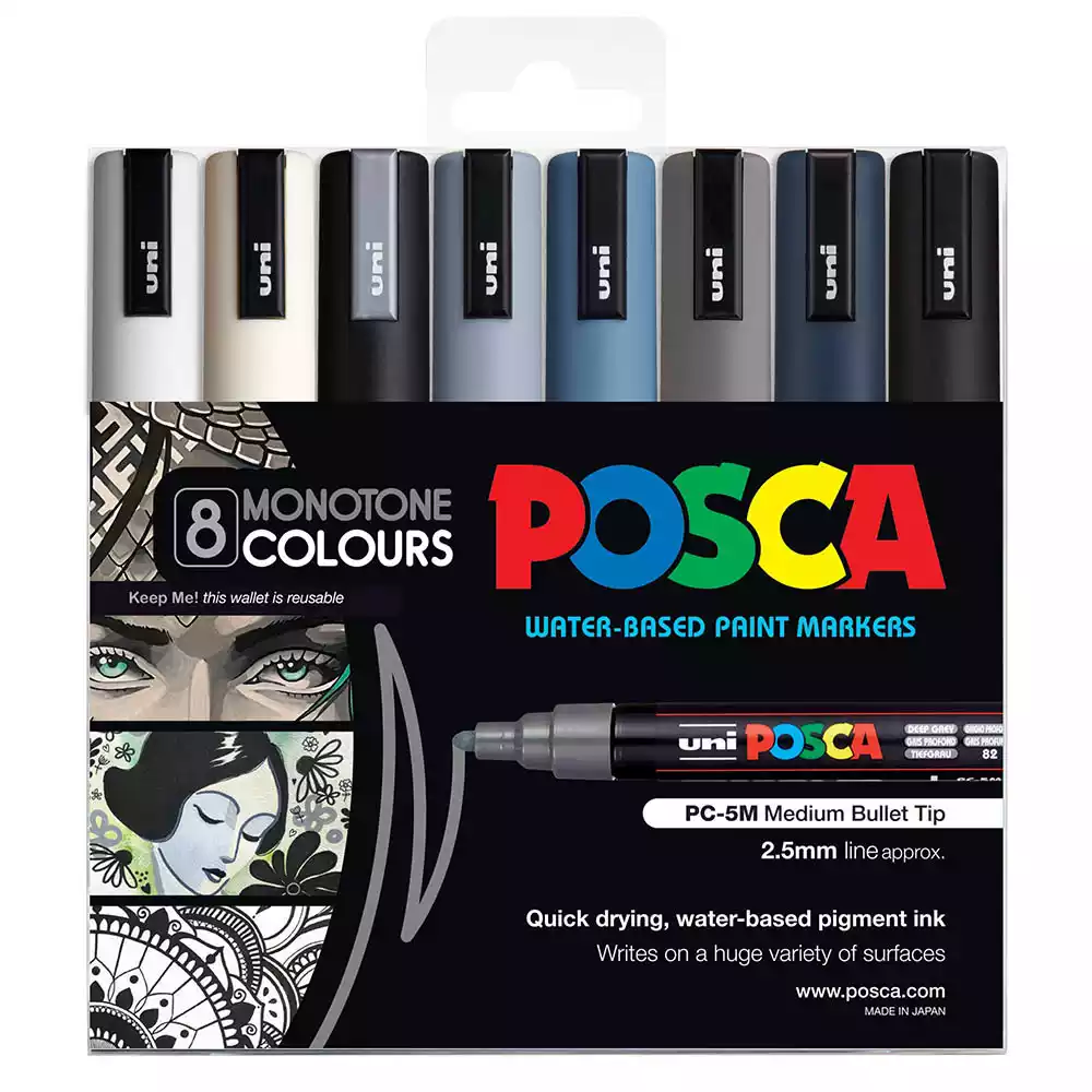 POSCA PC-5M PAINT MARKER BULLET MEDIUM 2.5MM ASSORTED MONOTONE COLOURS PACK 8
