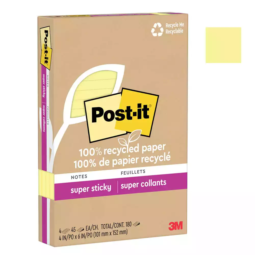 • POST-IT 4621R-4SSCY SUPER STICKY NOTES 101 X 152MM RECYCLED LINED CANARY YELLOW PACK 4