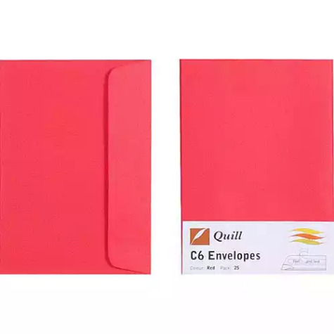 QUILL C6 COLOURED ENVELOPES PLAINFACE STRIP SEAL 80GSM 114 X 162MM RED PACK 25