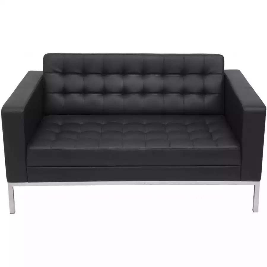 Rapidline Venus lounge with distinctive button finish ideal for reception or meeting areas | Elegant reception area two seat arm chair with button finish to black PU, easy clean upholstery | Stainless steel underframe and legs | Backed by a 3 year warranty | Button finish | SGS: EN12520 Certification