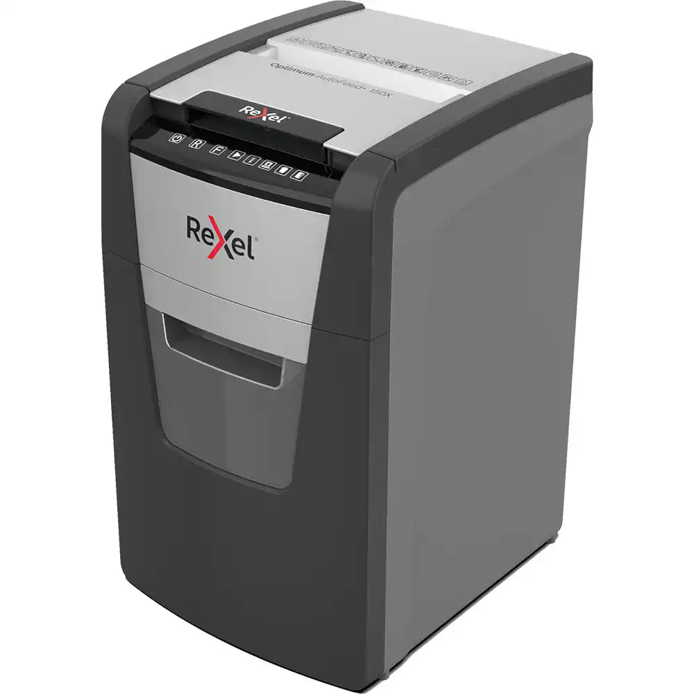 Any shredder protects against identity theft, but only Rexel Optimum AutoFeed models protect against productivity theft | Designed and engineered with superior feeding mechanism, the Rexel Optimum is really a walk-away solution | Larger bin capacities and longer running times also means you'll be saving on valuable time | Cross Cut | 150 Sheet Shred Capacity | 44L Bin Capacity | 30 Minute Run Time