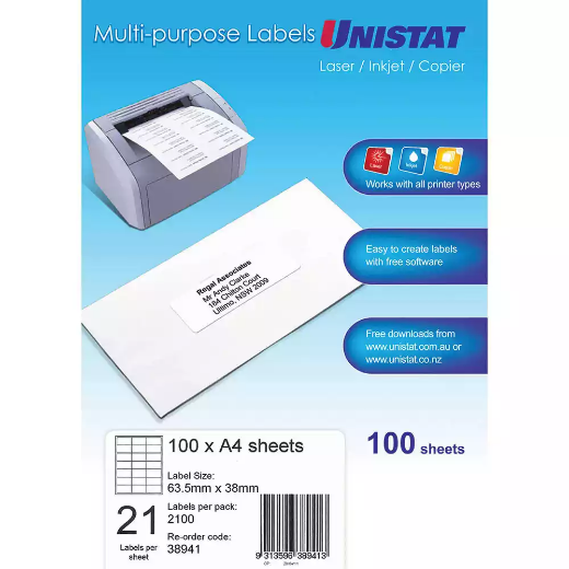 Picture of UNISTAT 38941 MULTI-PURPOSE LABEL 21UP 63.5 X 38MM WHITE PACK 100 Picture of UNISTAT 38941 MULTI-PURPOSE LABEL 21UP 63.5 X 38MM WHITE PACK 100