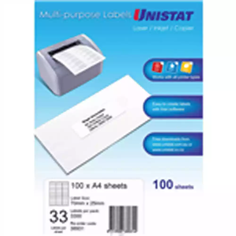 Unistat labels offer you a cost effective, software-supported solution for your labelling needs | Use Unistat labels in your laser printer, inkjet printer or copier | Select from a full range of mailing and parcel label sizes | | Ideal for addressing and other applications | Suitable for laser printers, inkjet printers and copiers | Self-adhesive ensures labels stay secure | Natural white finish