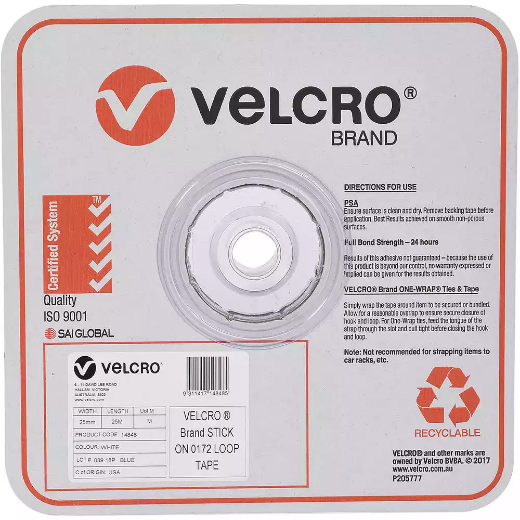 VELCRO Brand general purpose Loop tape is ideal for smooth surfaces and can be used indodors | Great for posters, maps, charts, display projects and craft projects | Perfect for everyday application | Simple peel and stick application | Adheres to smooth surfaces | Durable long lasting nylon construction | Adhesive reaches maximum strength after 24 hours | Not recommended for fabrics, flexible vinyl or underwater use | Continued exposure to full sunlight can damage fastener | Loop tape only, hook tape not included