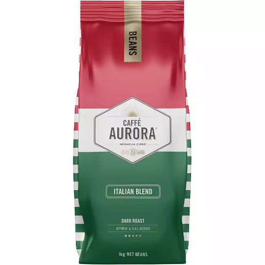 Caffe Aurora Italian Blend Coffee Beans are great for making your own home brewed coffees at home | The coffee has a full bodied flavour making it ideal for enjoying as an espresso or with milk for a latte | Distinctive Italian red and green packaging | Medium dark roast coffee beans with a rich well rounded cup to create a classic Italian style Espresso | The coffee has a full bodied, Italian style flavour | You can enjoy the coffee as it is or with milk | There is 1 kg in this pack so you can stock up at once