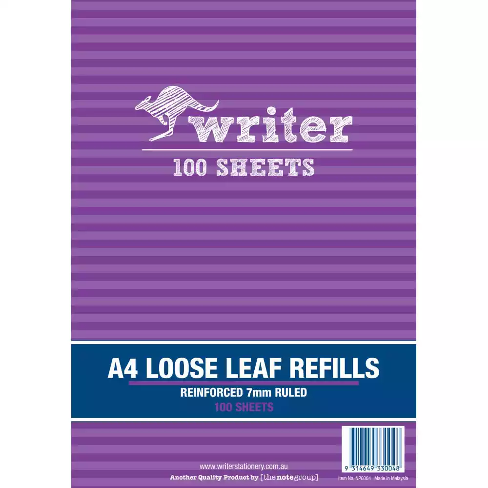 Writer A4 Loose leaf refill pad | Writer loose leaf refills can be used to refill pages in ring binders | Each page is pre-punched making them easy to insert, remove and update | Lined and margin ruled to keep your writing neat and consistent | Perfect for your everyday writing needs | Ideal for home, office and school | Reinforced binder holes | 7 hole punched | 7mm ruled two sides